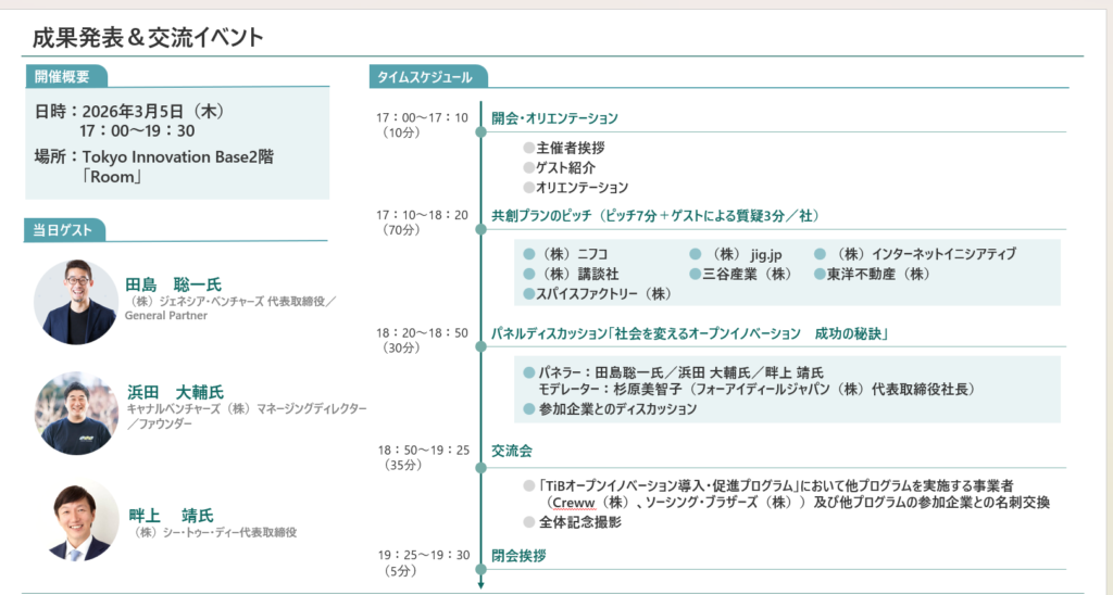 このたび、東京都のスタートアップ支援拠点「Tokyo Innovation Base(TiB)」と連携し「TiBオープンイノベーション導入・促進プログラム」の一環として、「自社の強み・弱みに基づく協業創出コース」の成果発表・交流会を2026年3月5日(木)に開催することとなりました。